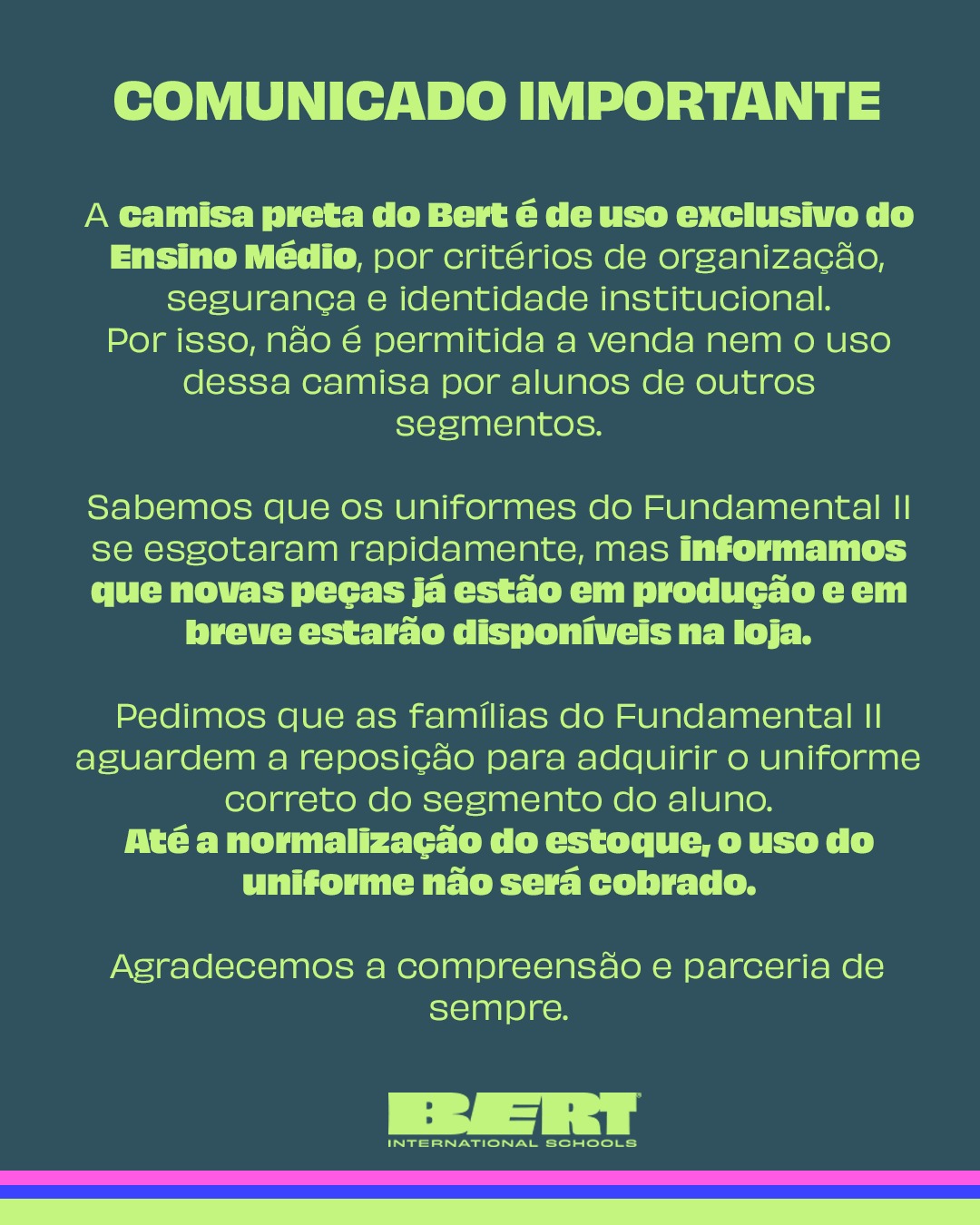 A camisa preta do Bert é de uso exclusivo do Ensino Médio e não é comercializada para outros segmentos.